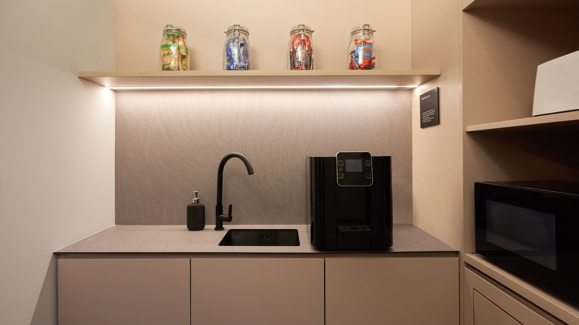 2 pantries equipped with complimentary coffee, tea, snacks, filtered water (hot and cold), microwave